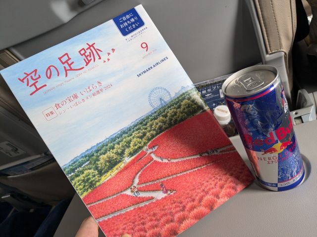 いつものレッドブルと、機内誌「空の足跡」。いばらき特集にちょっぴりテンションが上がります!いつの間にか、サイゼリヤと同じイラストの間違い探しが追加されており、しばらく夢中になってしまいました。