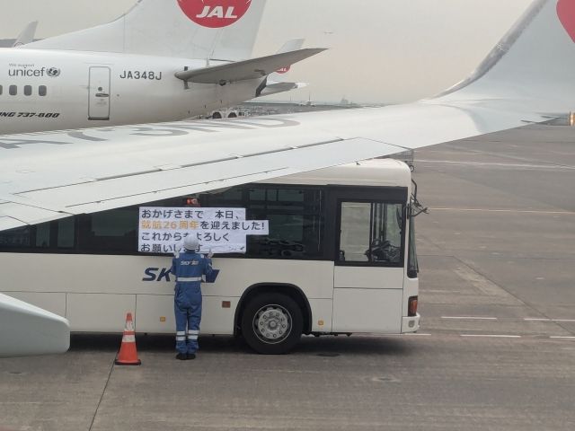 機内に乗り込み窓から外を見ると、バスに掲げられているのは「おかげさまで本日就航26周年を迎えました」の文字。調べてみると、スカイマークは1998年9月19日に東京/羽田 – 福岡線を開設したのがはじまりだったそうです。記念すべき日に搭乗できて光栄でごさいます!
