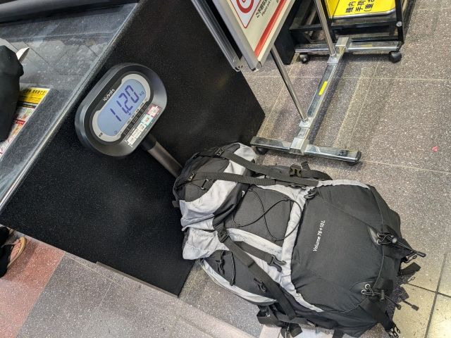 まずはスカイマークのカウンターに荷物を預け。大きめのバックパックを使っているので、ついつい何でも入れてしまう荷物。重量は11kgもありました・・・!