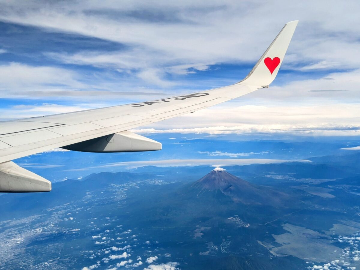 離陸から少しすると見えてくるのは雄大な富士山。夏なので雪もなく赤い姿が凛々しいです。山頂部に小さな雲がかかり、さらにその上には天使の輪のような雲も。なんだかかわいらしくもありますね。