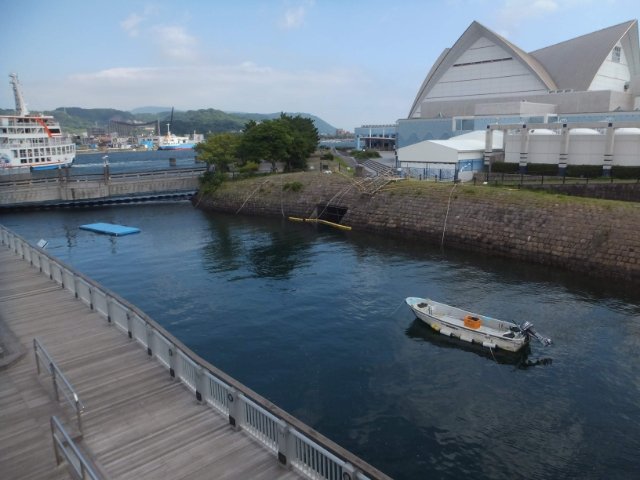 なんでわざわざ手前で降りたかと言いますといおワールドかごしま水族館の前を通りたかったのです!この水族館は、目の前の海を区切った水路にイルカが泳いでおり、水族館に入館しなくても無料でイルカ見れるのです。