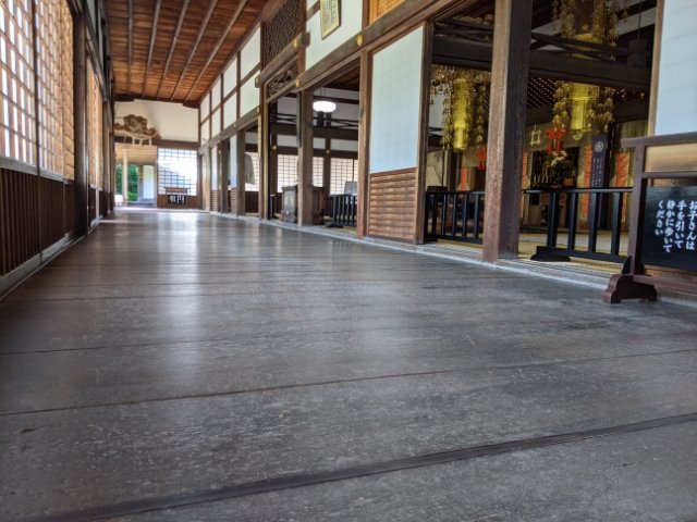 本堂の廊下は、人が歩くと音がするうぐいす張り。忍びなどの侵入者を知らせるための仕掛けです。ピヨピヨと鳥のさえずりのような、かなりクリアできれいな音がします。