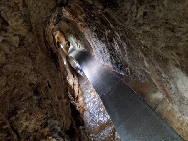 夏は涼しく冬は温かい洞内、水が流れる脇に造られた歩道を進んでいきます。道幅は狭いし天井はとても低い。鍾乳洞は基本的に狭い道がありますが、この龍河洞は特に狭い方ではないでしょうか。