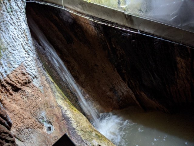 最初に目に入るのは、こちらの滝。昨晩から降り続く雨の影響か、ドバドバとかなり勢い良く流れています。