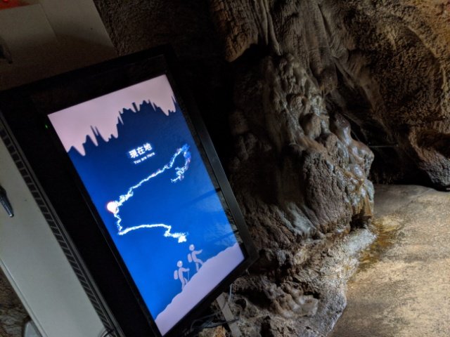 途中にはモニターの洞内マップも。急に現れるデジタル機器に少し違和感ありますが、薄暗い洞内ではモニターの光がちょうど見やすい。