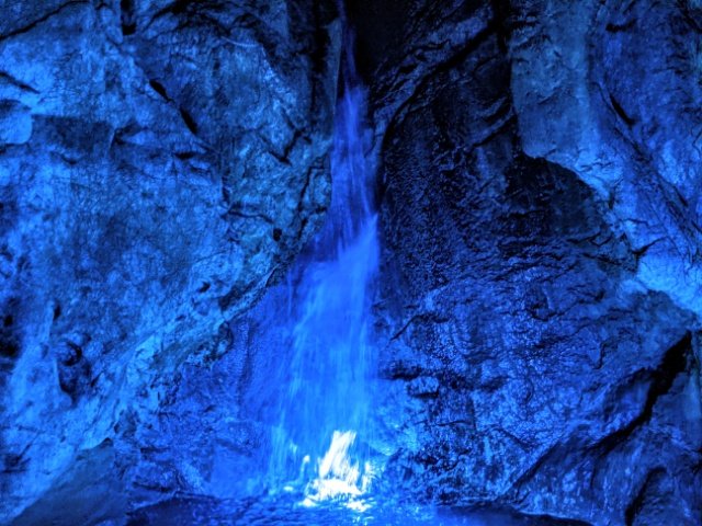 高さ11mの洞内最大の滝で、ブルーのライトアップがとても神秘的です。山内浩、松井正実の両名が滝の上部を探索したところ、大規模な鍾乳洞が発見されたそう。龍河洞探索のはじまりとなった記念すべき場所なのです。