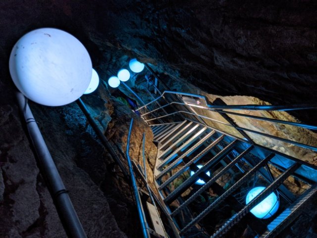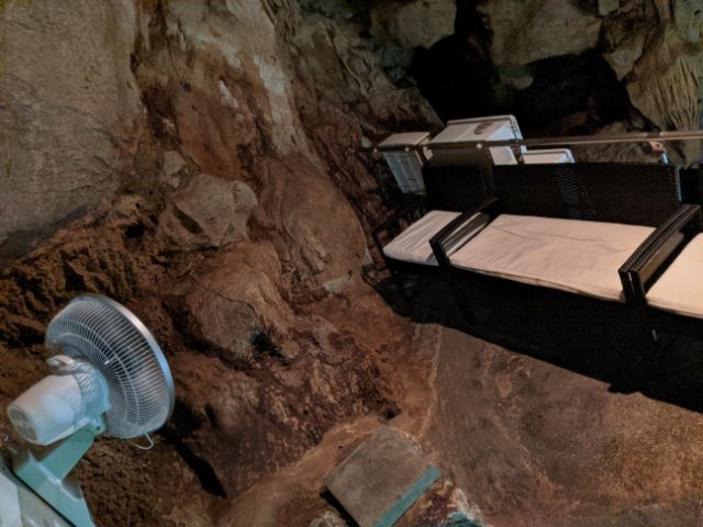 登り終えたところには、なんと座布団付きでゆったり座れるイスが・・・!さらに扇風機まで設置されてます。長い階段を登って火照ったカラダも、ここで一休みできる。洞内にこんなリラックススペースのある鍾乳洞、日本でここだけではないでしょうか。
