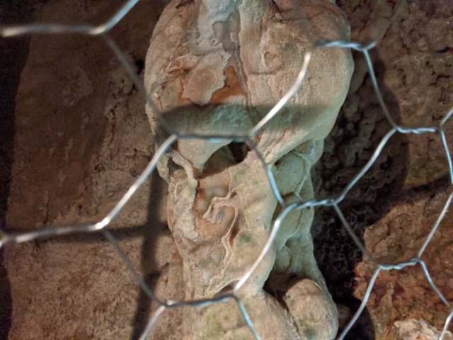こちらをギロリと睨んでいるように見える、不思議な鍾乳石。頭部が大きいため宇宙人のようにも見えます。フェンスに包まれており、危険な存在のようなオーラを感じます。