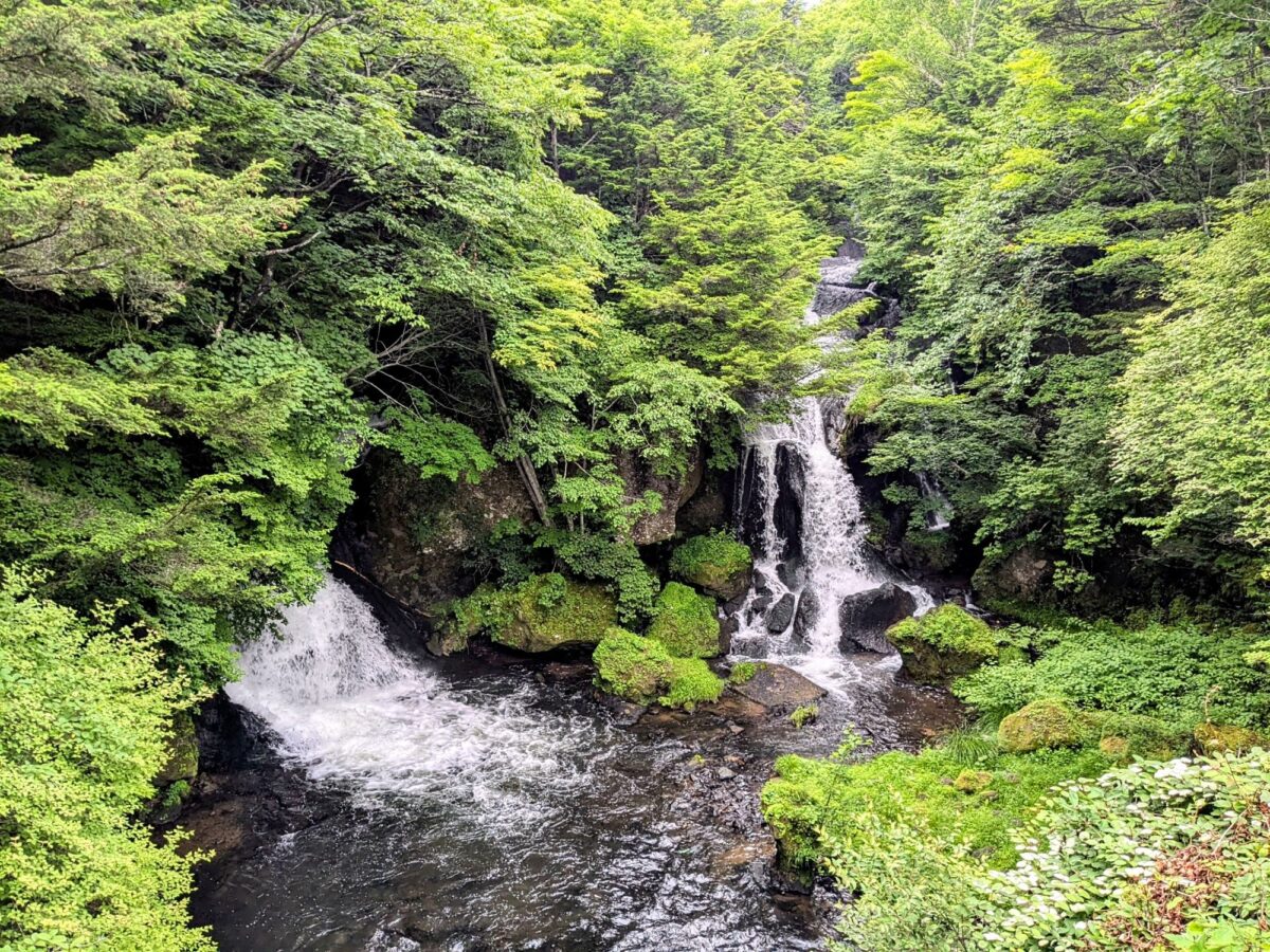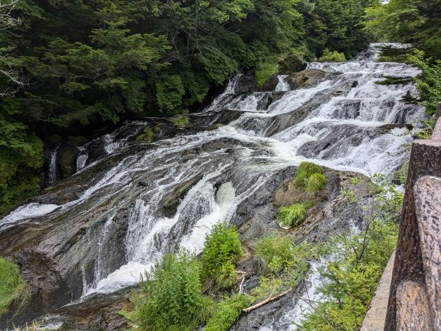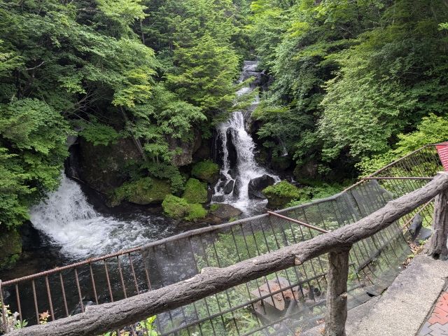 華厳滝、湯滝とともに奥日光三名瀑にも数えられる滝。夏場の訪問であったため、鮮やかな新緑が滝を彩ります。秋に訪れると、紅葉で赤く染まる姿も見られるそうです。