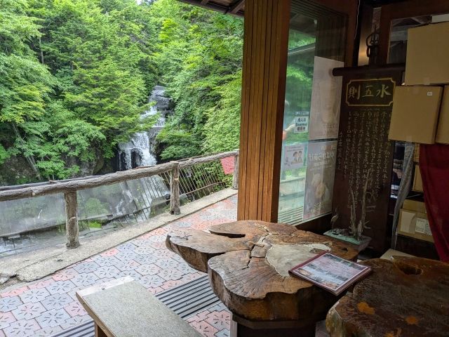 奥へ進むと、なんとお店の中から滝が見えるのです!しかも、ここがどこよりもベストビューポジションという仕様。茶屋のメニューを楽しみながら、腰掛けてゆったりと見ることができるという、とってもラグジュアリーな滝なのです。