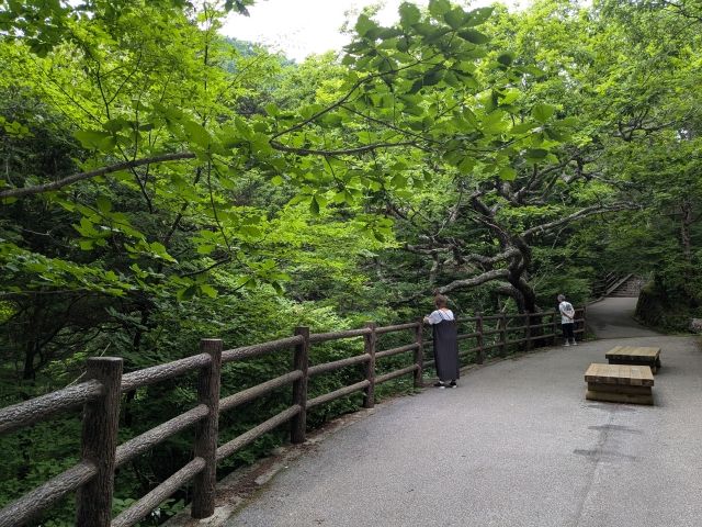 滝の上流へと続くのは、舗装された歩きやすい道。途中にはベンチもあるので、ひと休みもできます。