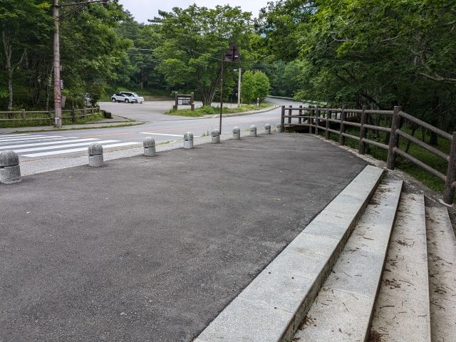 上りきると車道が見えてきました。ここまで茶屋から8分ほど。すぐ側に滝上駐車場もあります。すぐ見えて物足りなくなるのを回避するならば、ここに停めて滝を目指すと満足感が高まりそうです。