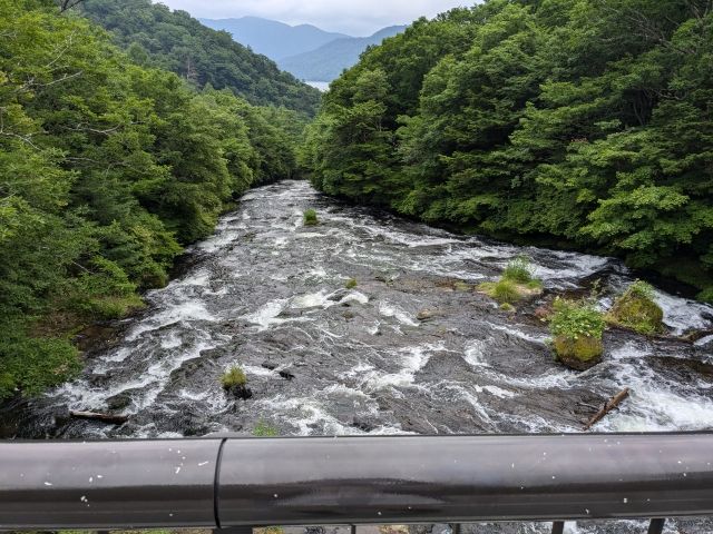 流れる先にはちらっと中禅寺湖も見えます。この流れは竜頭の滝となり、中禅寺湖に注いでいるのですね。