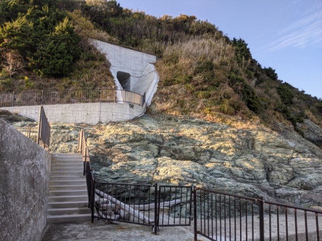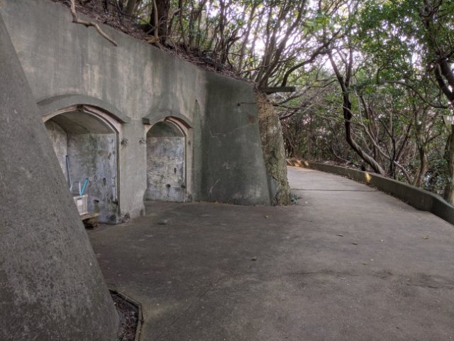 佐田岬灯台駐車場から佐田岬灯台へと向かう道も、かつて砲台への輸送ルートとして築かれた道。そのルート上には、移動式探照灯格納庫も残されています。かなりしっかりとしたコンクリート建築で、保存状態も良好です。