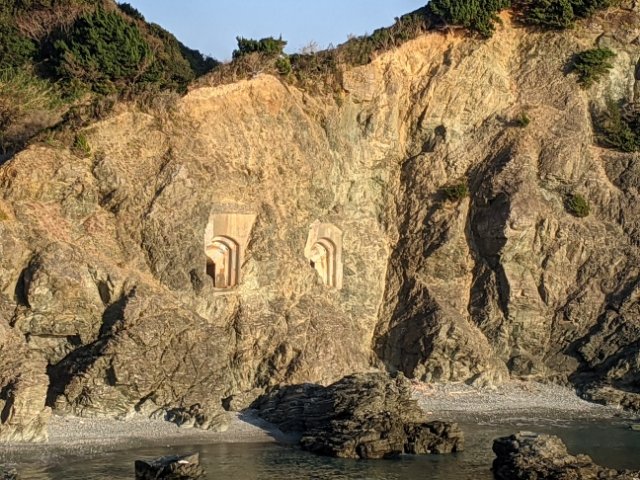 佐田岬灯台の下をの方の岩肌をよく見ると、洞窟砲台らしき跡が見えます。見学は不可ですが、あちらにも洞窟式の砲台が設置されていたのですね~。