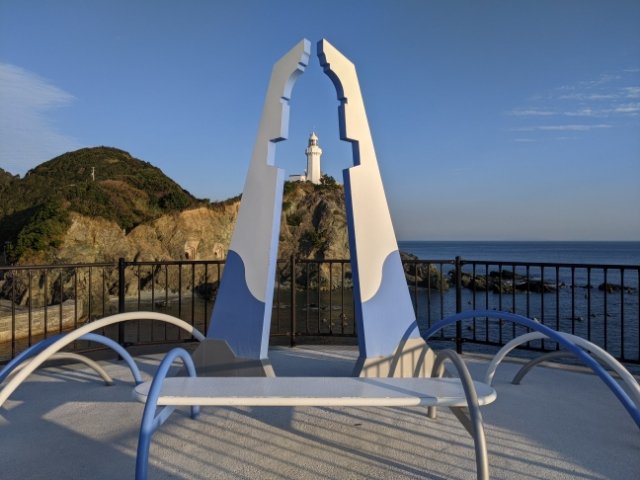 水色と白のさわやかなモニュメントは、「永遠の灯(とわのあかり)」。よりそう2つの柱は、灯台のカタチをくっきりと描いています。