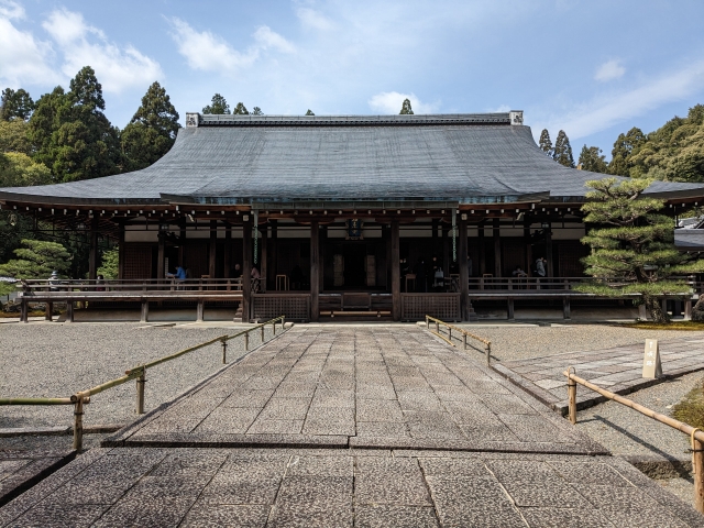受付を済ませて順路にそって進むと、本尊の阿弥陀如来を安置する本堂が見えてきます。昭和44年(1969年)に京都大学名誉教授村田治郎によって再建されたものであるそう。