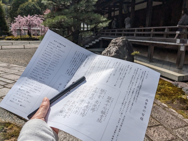 まずはこの本堂にて写経からスタート。受付のときにいただける筆ペンを使って「延命十句観音経」という42文字を書き記していきます。