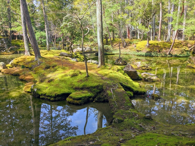 写経を終えて境内を進むと、いよいよ苔の庭園が見えてきます。まず感じるのが、自然味が豊かということ。池泉式庭園ということで池が造られているのですが、庭園の池というよりは自然の中の小川のような雰囲気。