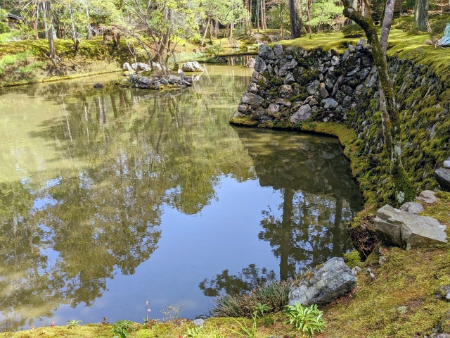 庭園の中央に広がるのは黄金池(おうごんち)。心の字を象っており、心字池とも呼ばれています。よく見ると、池のまわりの一部には立派な石垣も組まれています。