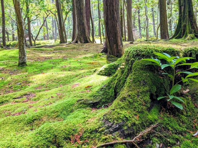 視界一面に広がるのはモスグリーンの苔の世界。ふわふわとした質感には、不思議な安心感があります。この庭園では約120種の苔を見ることができるそうです。