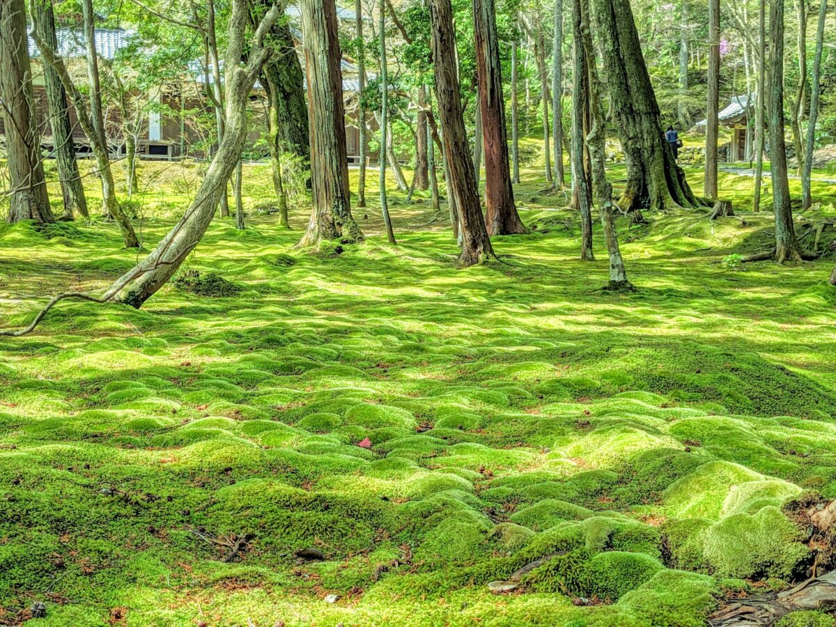 視界一面に広がるのはモスグリーンの苔の世界。ふわふわとした質感には、不思議な安心感があります。この庭園では約120種の苔を見ることができるそうです。