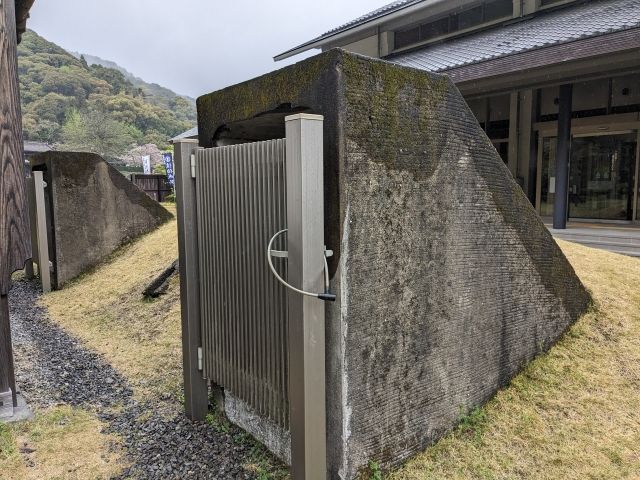 こちらは防空壕跡。1934年に佐伯海軍航空隊が開隊されます。この地にあった料亭は海軍士官の社交場となり、この防空壕はそんな士官のために築かれたと考えられています。入口はコンクリート、地上部分は盛土で目立たないようになっております。