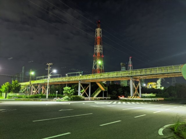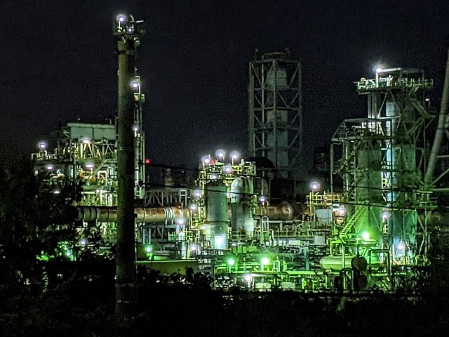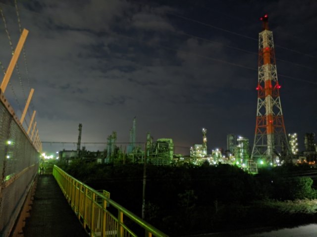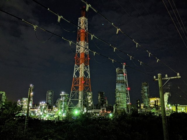 アングルが限定されるため、電線と電柱が入ってきてしまうのがちょっぴり欠点。でも、そもそも工場夜景は無機質で人工的なものなので、これはこれでアリな気も。