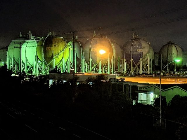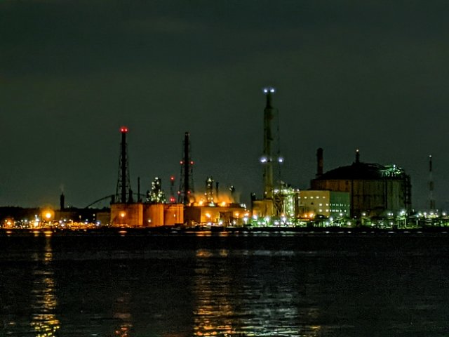 反対側を見ると、暗闇に立ち並ぶガスタンクの姿。新潟県で見られるニコタンみたいに、顔を描きたくなりますねー。