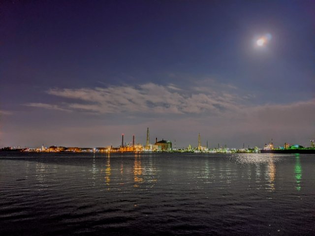 続いて向かったのは、高砂1丁目歩道橋から2.5kmほど進んだところにある築港浜寺西町。ここは対岸に広がる工場夜景を見渡すことができる鑑賞スポット。海辺に月明かりが反射しており、夜なのにすごく明るく感じます。