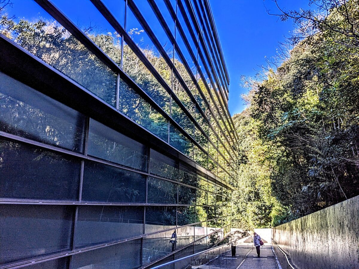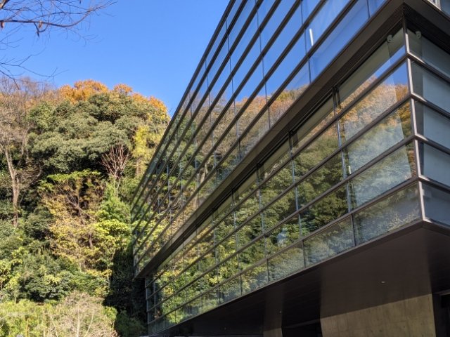 一面にガラスが張られたガラスカーテンウォールは、城山の豊かな自然の景色を写し込みます。よく環境を配慮したカラーリングの建物を「自然に溶け込む建築」といったりしますが、このようなカタチの溶け込み方もあるのですね。