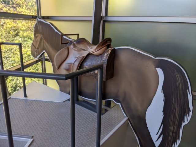 日露戦争時に騎兵隊が利用していた日本の在来種の高さを体験できる「体高コーナー」。鞍が敷かれているので意外と座り心地は良いです!