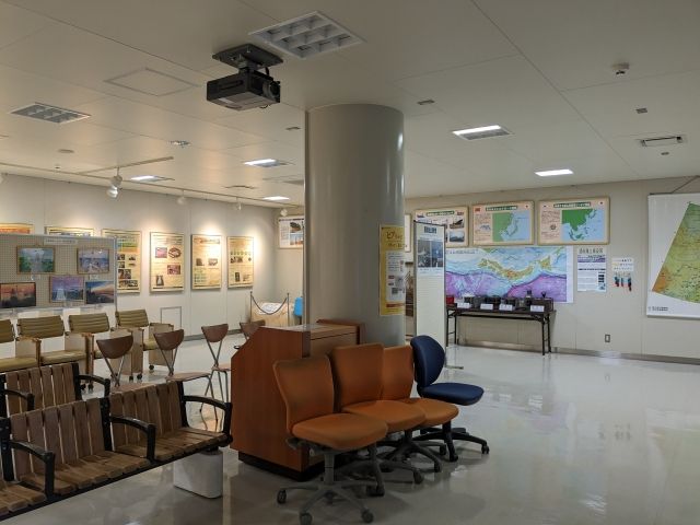 入口では優しそうなおじさんが出迎えてくれました。1階はちょっとした展示室。酒田港の解説パネルや解説映像を見ることができます。