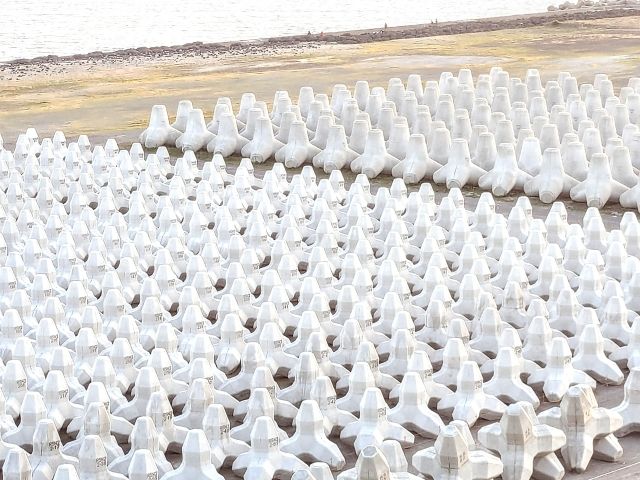 ずらりと並ぶ消波ブロックたち。海辺の誰もいない場所に整然と並ぶ姿はなんか現代アートみたいですね!