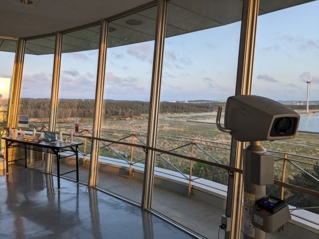 さて、そろそろ展望室へ行きましょう!エレベーターを使って、地上約18m、海抜32mにある7階展望室へ。3方向がガラス張りで開放感は抜群です。