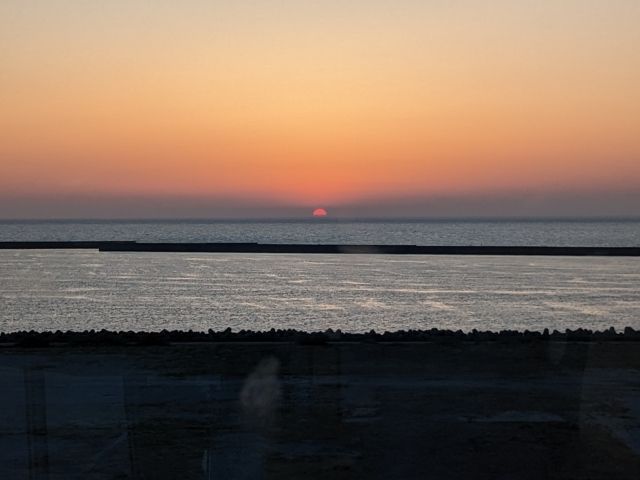 太陽が溶けるように海へと沈んでいきます。18:35ジャストに日没。関東に住んでいると見ることができない、海へと消えゆく太陽に心を奪われます。
