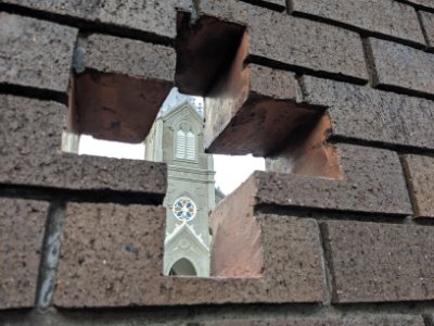 教会前のレンガ塀には十字架のくり抜き。五島列島の教会は、禁教期に信徒たちが潜伏していた場所に建てられたものが多かったのですが、この崎津教会はかつて「絵踏み」が行われた屋敷があった場所に建てられています。