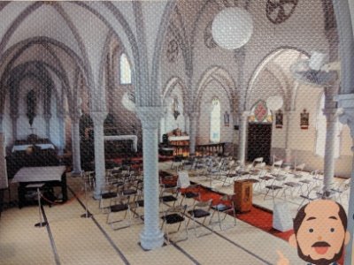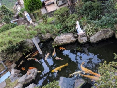教会のすぐ手前にあるルルドの泉では、ニシキゴイが悠々と泳いでおります。畳敷きの内部と相まって、非常に和風な要素のある教会です。