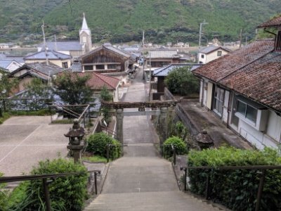 なお、この神社の裏手には「教会の見えるチャペルの鐘展望公園」へ続く階段があります。約500登りきると、そこからは海沿いに広がる集落の姿を見渡すことができるそうです。