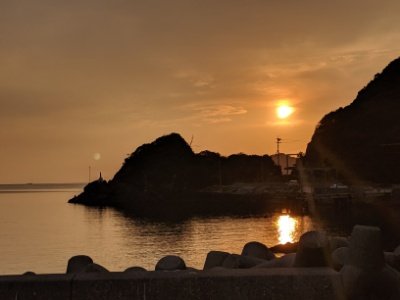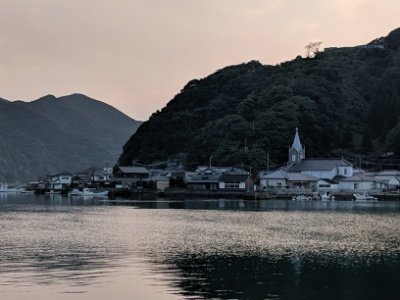 こちらが人気のアングル。夕陽は山の影に隠れてしまいますが、薄暗くなってきた中に浮かぶ崎津集落は神秘的。とにかく崎津教会が凄い存在感を放ちます。静かな漁村にそびえる教会は強烈な違和感。崎津教会には「海の天主堂」との呼び名もあるそうです。