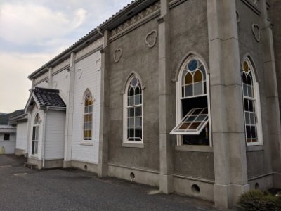 崎津集落を代表する建築がこの崎津教会。コンクリート造りのずっしりとした建築で、天を突くかのようなゴシック様式が印象的な教会です。この教会は、1934年にハルブ神父と住民の寄付により完成しました。