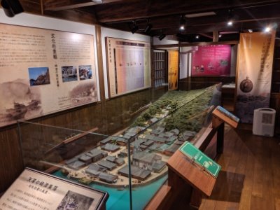 この建物は昭和11年に建てられた旅館「みなと屋」を改修したリノベーション資料館。間取りなどはそのまま利用しているため、非常に趣のある館内となっています。展示内容はとても新しく、パネルや映像コンテンツでとってもわかりやすい。交易により栄えた昭和初期の崎津の様子を表したジオラマなどの展示もあります。