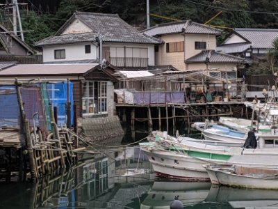 崎津集落はとても静かな漁村。竹などで作られた海に張り出した作業場「カケ」など、この集落独特の景観も見ることができます。