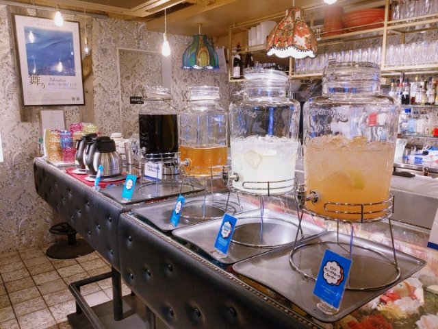 ランチタイムは通常200円のドリンクバーが無料!レモネードソーダ、ピンクグレープフルーツウォーター、ジャスミン茶など、すっきりした飲み物が多く、エスニックメニューと合いそうなラインナップです。