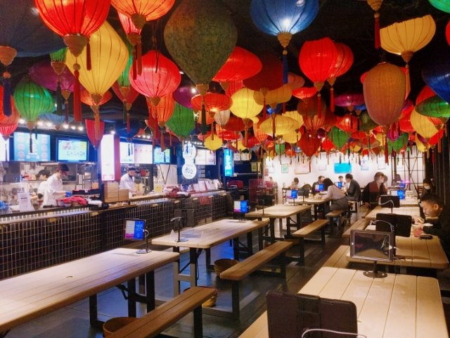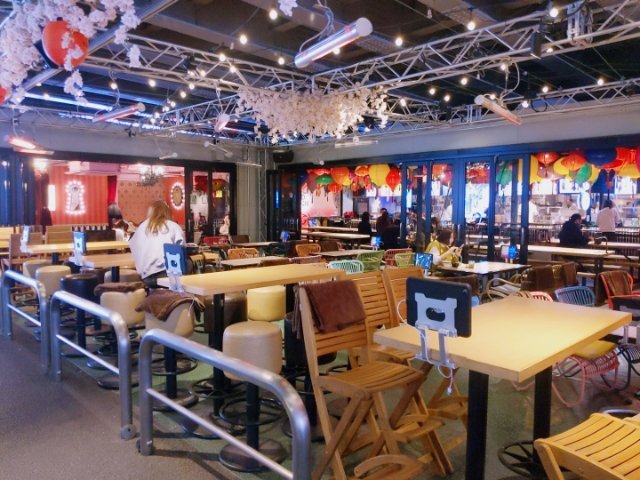 昼はフードコートのようなセルフスタイル、夜は座席からタブレットで注文するという形態をとっています。