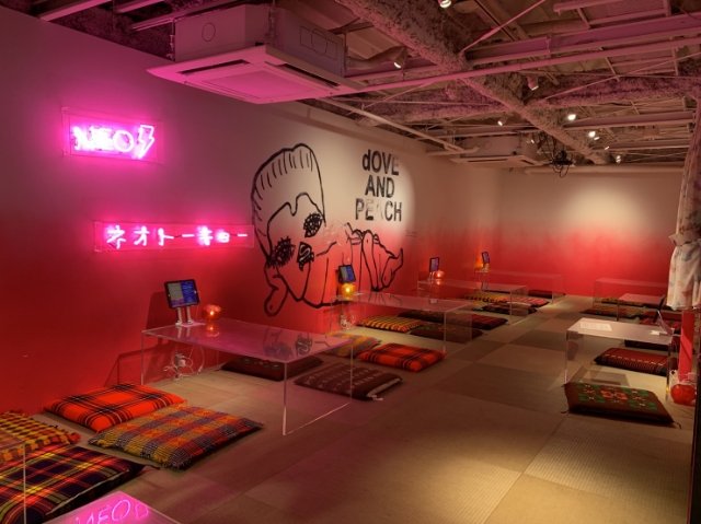 畳敷きのこあがり席「サナDの寝床/ TATAMI」。ピンクグラデーションの壁にはウォールアートと、ネオンで飾られた「ネオトーキョー」の文字。いかにもSNS映えしそうな鮮やかなシートです。