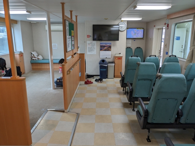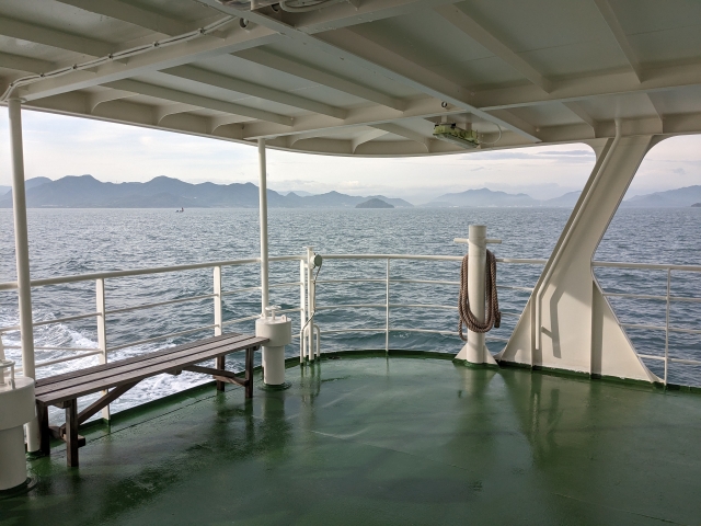 2階が海風をダイレクトに受ける屋外デッキ席。開放的で気持ち良いですが、乗船時間が55分と長めなので早々と退散。屋内席でゆったりと過ごしました。