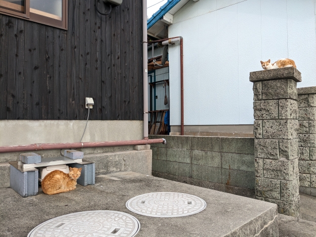 港の前には数件の民家がありますが、既に数匹のネコがスタンバイ。人を見つけると駆け寄ってくる懐っこいネコも。