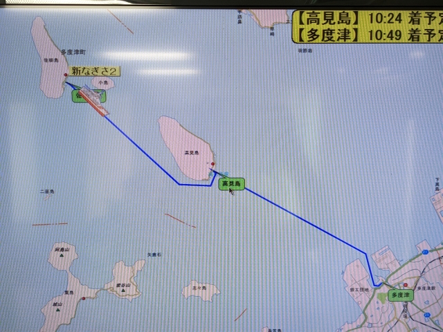 佐柳島には多度津港よりアクセス。港を出航した船は、高見島へ立ち寄り。その後、佐柳島へと寄港します。