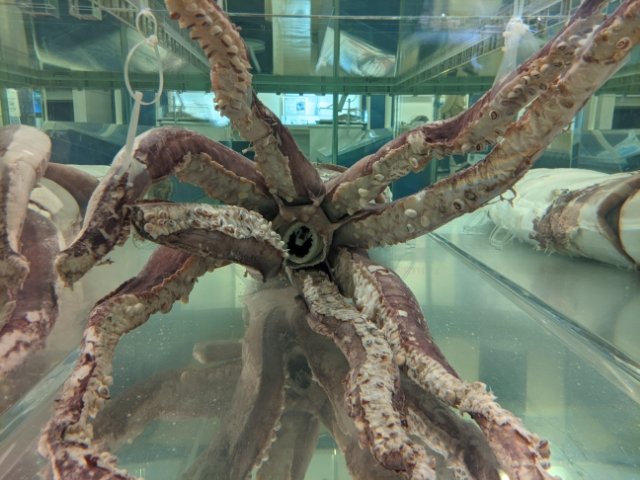 側面も透明なガラスとなっているため、しゃがんで見るといろいろな角度からダイオウイカを見ることができます。